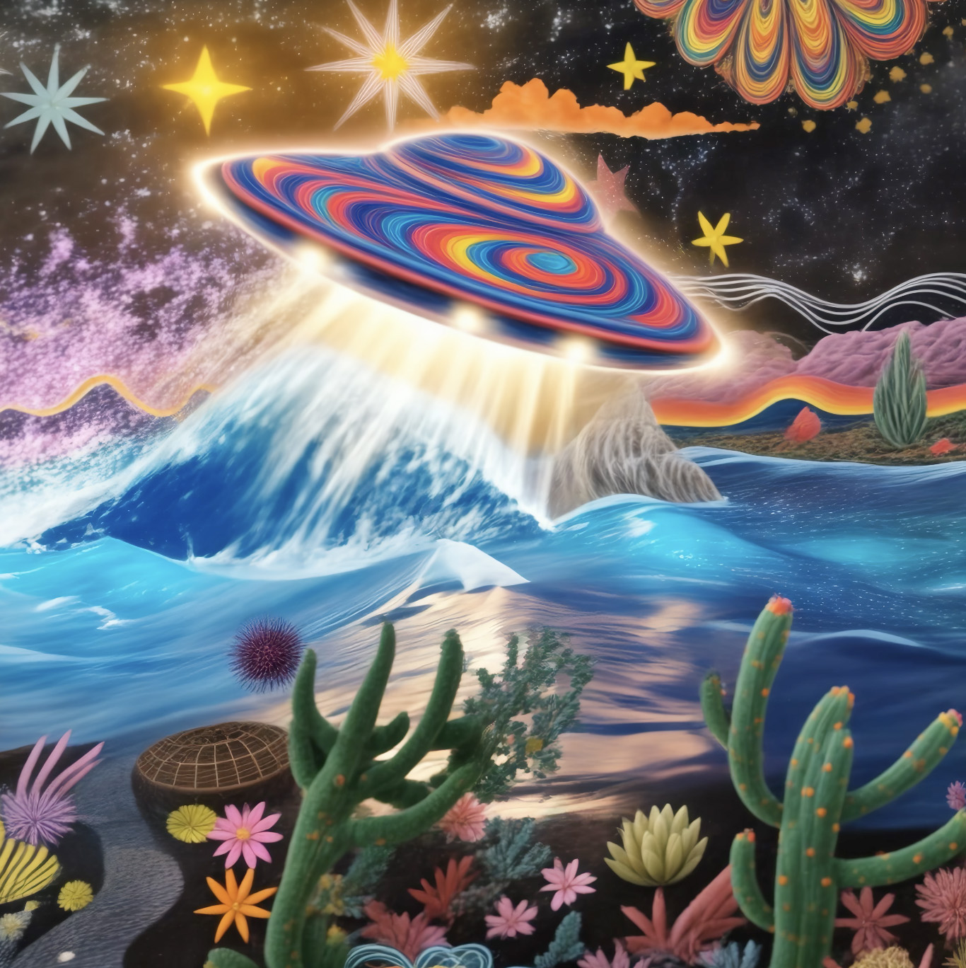Animated digital artwork from the Surrealist Landscapes series, featuring a vibrant desert-ocean dreamscape under a star-filled sky. The piece combines glowing celestial bodies, rainbow-hued horizons, towering cacti, and luminous underwater flora in a continuously evolving animation that blurs the boundary between land, sea, and cosmos. Video, 2026.
